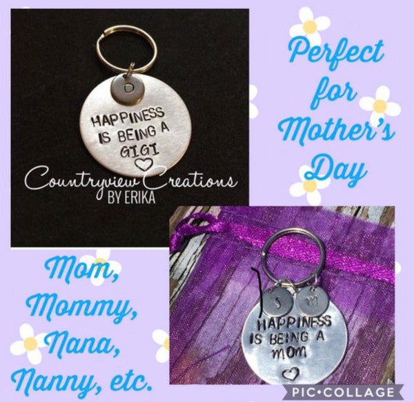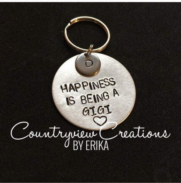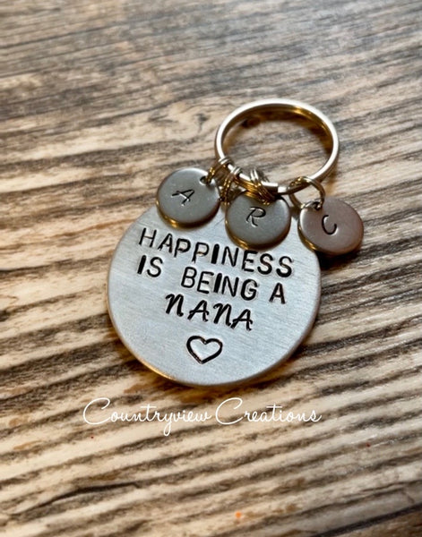Aluminum round with stainless steel rounds with the initials added. Happiness is being a -nana, mama, mommy, Gigi, nana, aunt, Mimi, etc